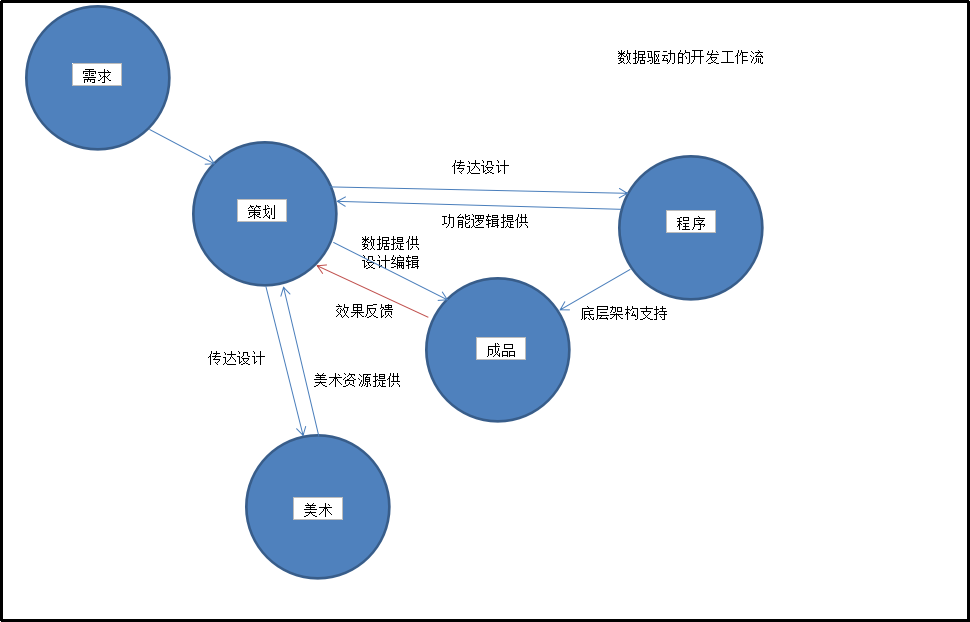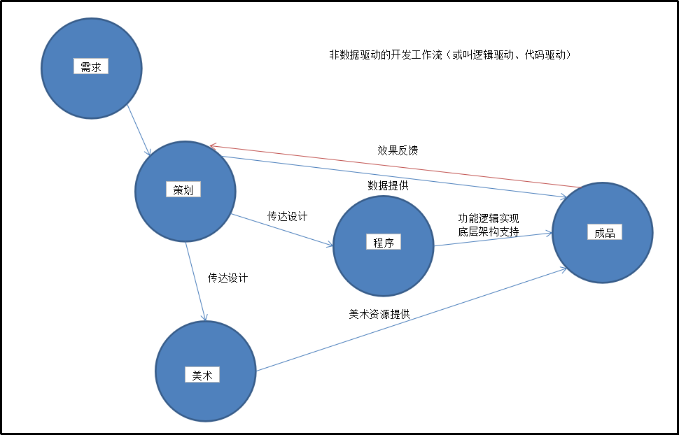 而数据驱动下(如下图),认为一切皆为数据(包括逻辑功能),此时程序和美术转而为策划人员提供“素材”,支持策划人员进行世界编辑,最终完成成品。