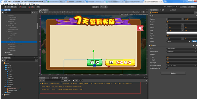 通过访问 game_scene.fire 源文件,找到 itemNode 相关的数据,然后将它删除,之后重启项目层级管理器上 itemNode 消失。