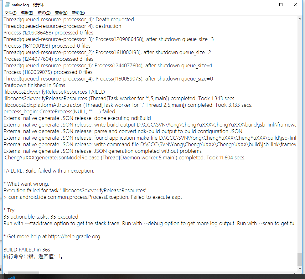正在执行:’“D:\CCC\SVN\Yong\ChengYuXXX\ChengYuXXX\build\jsb-link\frameworks\runtime-src\proj.android-studio\gradlew.bat” --parallel --info assembleRelease’