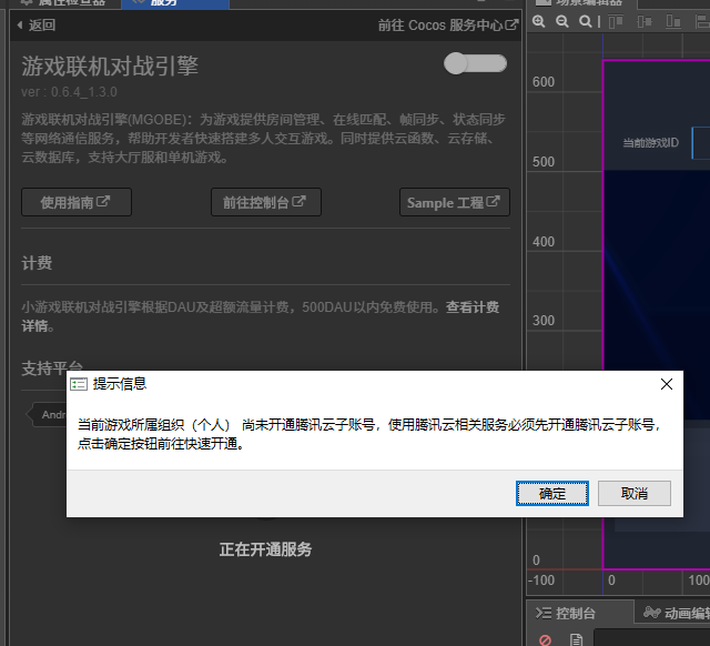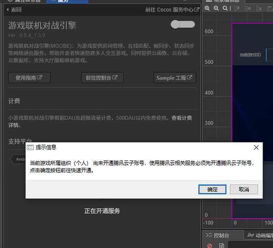 使用cocoscreator2.3.4新建了一个联机对战引擎demo,然后控制面板选择开启对战引擎,已经注册了cocos帐号,但是腾讯云子账号死活认证不了,用微信扫描弹出来的认证菊花码,会报一个错,然后就一直转圈圈没反应了。
