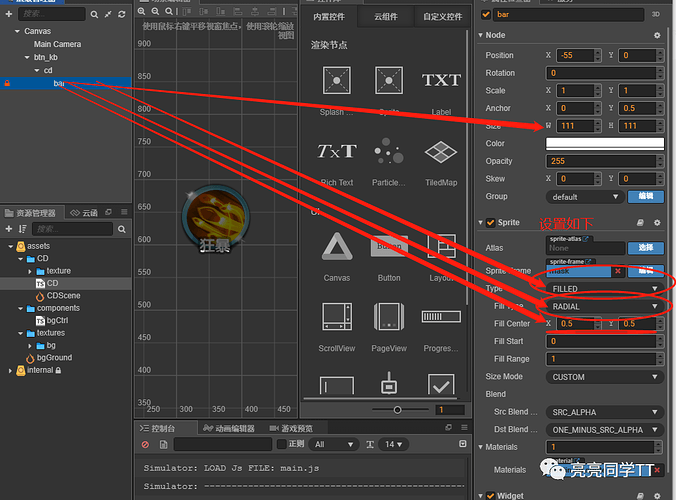 总体思路:利用cocoscreator中的progressBar(进度条)组件,调整进度条形状为技能图片形状,修改显示模式为 填充模式 ,填充方向选择扇形,填充时的中心点为 节点中心 即cc.v2( 0.5,0.5),这样 进度条就会按照一个扇形的形状进行填充 ,但是 CD是 进度条的 缩减,所以 让进度条 反向取差值就可以了。