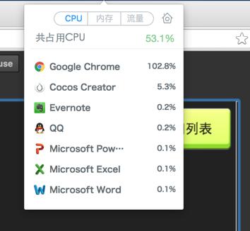 使用Cocos Creator1.1.0开发调试摘星星游戏,风扇马上就响了,发现CPU到达了88%(平时只有10%),内存占到了133%,使用模拟器正常,CPU只增加一点点。