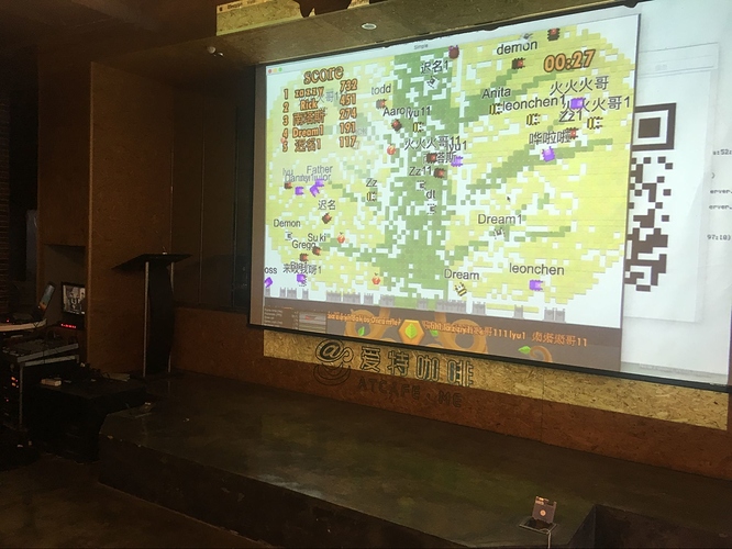 游戏的技术框架自然是使用我们的 Cocos Creator,制作效率上还是很有保障,尤其是搭建 UI 和动画很方便,具体的后面说。还有一点很有趣的是用了 HappyFunTimes 这个本地多人联机框架,这个框架支持由服务器运行游戏并显示在大屏幕上,玩家通过手机访问游戏 controller 页面,将手机浏览器变为 controller 并接入游戏,所有人一起在同一个大屏上进行游戏。