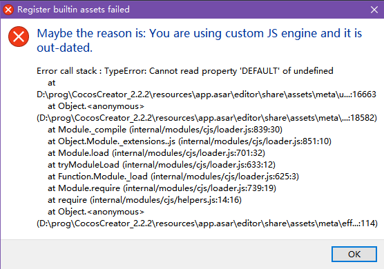 我也出现了这个现象,原因是因为从控件列表里面拖动了一个控件的资源栏中生成了一个新的Prefab,然后退出了该工程之后,重新开另外一个工程,就从此都进不去了,一直报也楼主一样的错误
