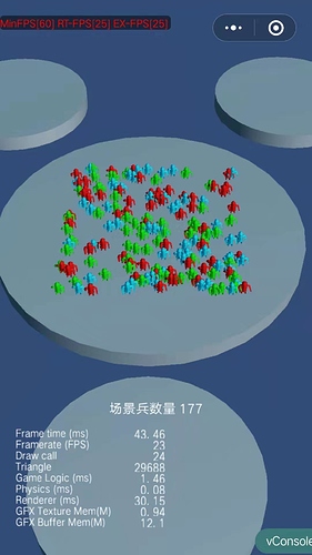 OPPO R9S Cocos制作微信真机测试177个士兵模型(非动态修改material 可见dc合并良好)