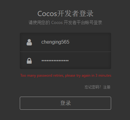 开始用之前的cocos账号试了,一直提示用户名或者密码错误,但是我拿用户名和密码登录论坛是可以的,并且另一台电脑(mac)可以正常使用,我以为不能登录两个账号,又注册了一个新的账号,同样提示用户名密码错误,但是我用新注册的账号也照样可以登录论坛。