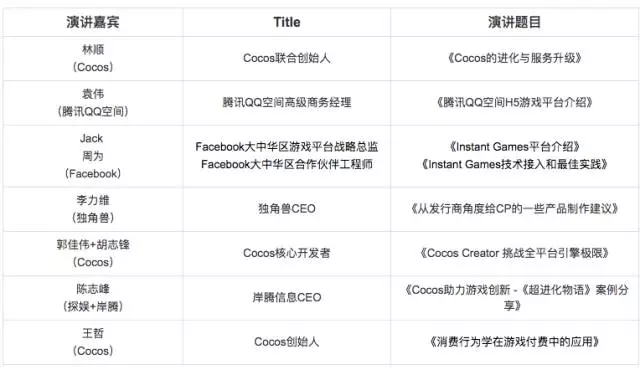 本次沙龙邀请到游戏圈内多位知名的大佬坐镇主场,其中不乏有来自Facebook、腾讯、独角兽、探娱、岸腾等众多重量级大咖,他们将用全新视角对原生市场新机会和H5游戏正确运营方向提出个人独到的见解。沙龙现场,还有众多来自Cocos社区的成功案例和宝贵开发经验分享,为Cocos众多游戏开发者提供面对面的技术和产品开发经验交流。