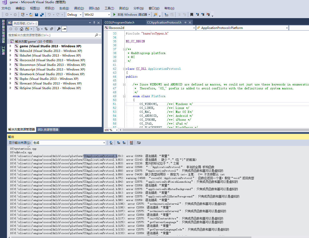 因为最近要上一个谷歌包,然后听说谷歌8月份开始要线上所有的包支持64位指令集,而我现在用的Cocos 3.10所用的第三方库很多都不支持64位指令集,只好去下载了Cocos 3.17,然后把库都替换了,替换完了,我就用VS 重新编译一下,然后出现各种各样的错误,硬着头皮把能修的都修完了,但是就剩一个CCApplicationProtocol.h文件的编译报错,报错得莫名其妙,只好去网上翻资料,但是也找不到想要的,只好在这里看看哪位大神遇到过这种问题,帮小弟看看,在这里先跪谢了。