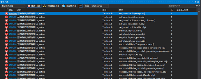 Cocos4.0版本的引擎创建的项目,cocos compile -l lua,创建完成之后直接使用cocos compile -p win32编译,报错无法解析的外部符号,lua_settop等等跟lua操作相关的函数,报错的项目是ext_luasocket,ext_lua,libcocosd等几个项目下。使用vs2019也是同样的报错