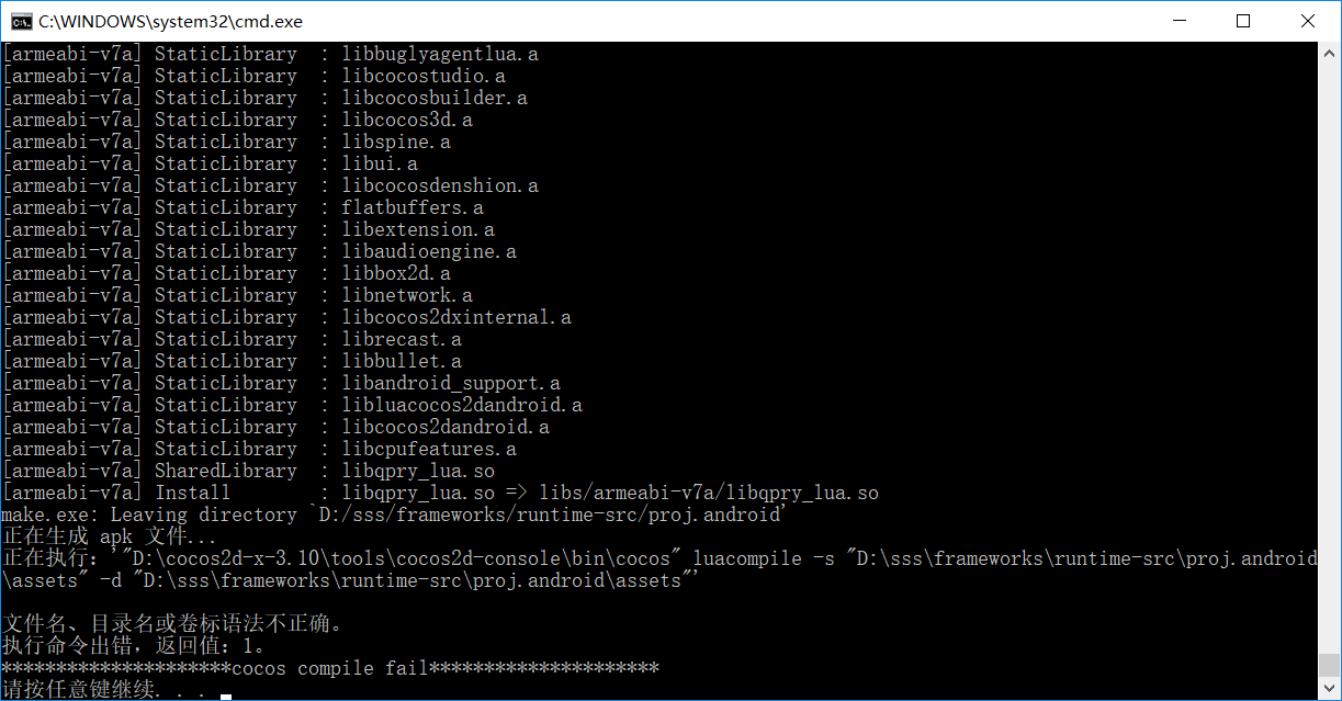 正在执行:’“D:\cocos2d-x-3.10\tools\cocos2d-console\bin\cocos” luacompile -s “D:\sss\frameworks\runtime-src\proj.android\assets” -d “D:\sss\frameworks\runtime-src\proj.android\assets”'文件名、目录名或卷标语法不正确。执行命令出错,返回值:1。