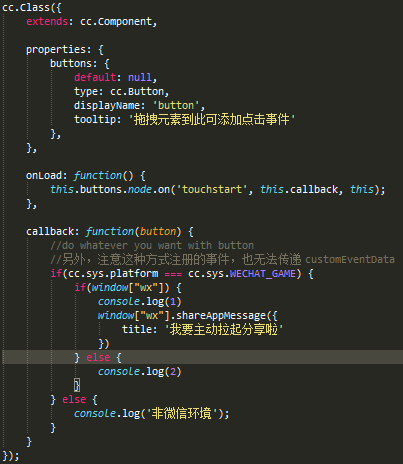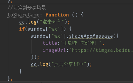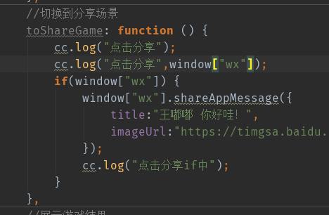 我们将 下面的转发微信转发API 放在你想放在的cocos 脚本中,然后她会报错,不过没有关系,