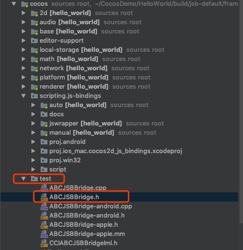 C++作为连接js层和Native层的桥梁,既然要实现jsb调用,那第一步肯定是要先把C++层的头文件和实现准备好,这里我们在build/jsb-defaul/frameworks/cocos2d-x/cocos创建一个test文件夹用于存放相关文件,