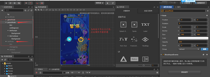 错误详情:当游戏结束后激活了一个展示胜利界面的节点winNode,并调用cc.director.pause(),该节点挂有block input event组件。但是点击winNode上的下一关按钮点击无响应,反倒是可以透过winNode节点,点击游戏界面上的按钮。此外,点击按钮会有放大效果,使用cc.director.pause后也失效了。