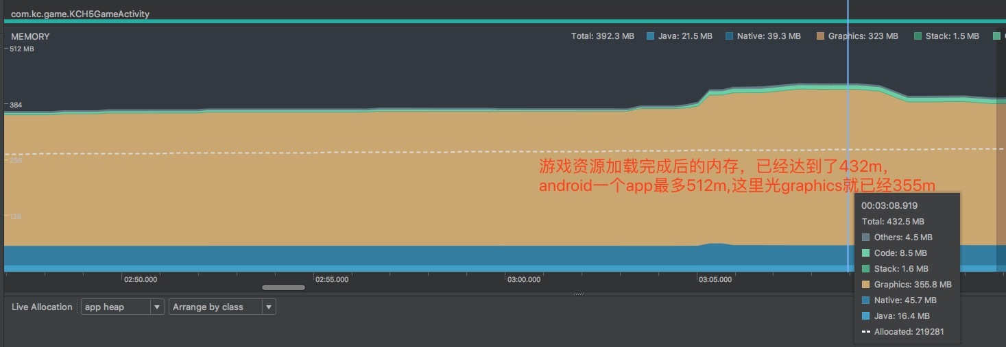 而android 应用最多512m加上本身应用还有200m,导致在玩游戏的时候 直接崩溃,我们的游戏就1个场景,一上来将所有资源加载完,图片能用图集的都使用图集 不能的也是用的自动图集