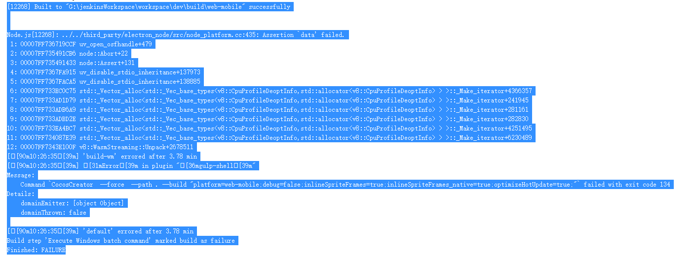 20:32:31 /var/folders/91/ksyth87x1v97lnscc5862pm00000gn/T/jenkins1517776017020949988.sh: line 49: 5587 Abort trap: 6 /Applications/CocosCreator.app/Contents/MacOS/CocosCreator --path . --build “${args}”