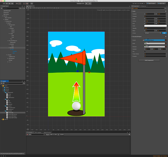 最近公司需要做一款高尔夫球的小游戏,本来考虑用cocos creator 2.1.1的3D功能,但是无奈目前整个3D体系还不完善,又怕遇坑,加上时间和工作量与回报不成正比,所以索性用纯2D(位移、缩放)的方法做了个伪3D效果,效果还不错,如图: