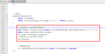第八步,打开Game.js脚本,在gainScore方法中添加如下,这样当收集到星星的时候,就会出现华丽的爆炸特效咯。