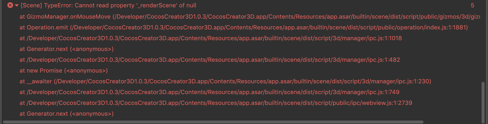 [ERROR] (/Developer/CocosCreator3D1.0.3/CocosCreator3D.app/Contents/Resources/resources/3d/cocos2d-x-lite/cocos/scripting/js-bindings/jswrapper/v8/Object.cpp, 534): Invoking function (0x783ceadac0) failed!