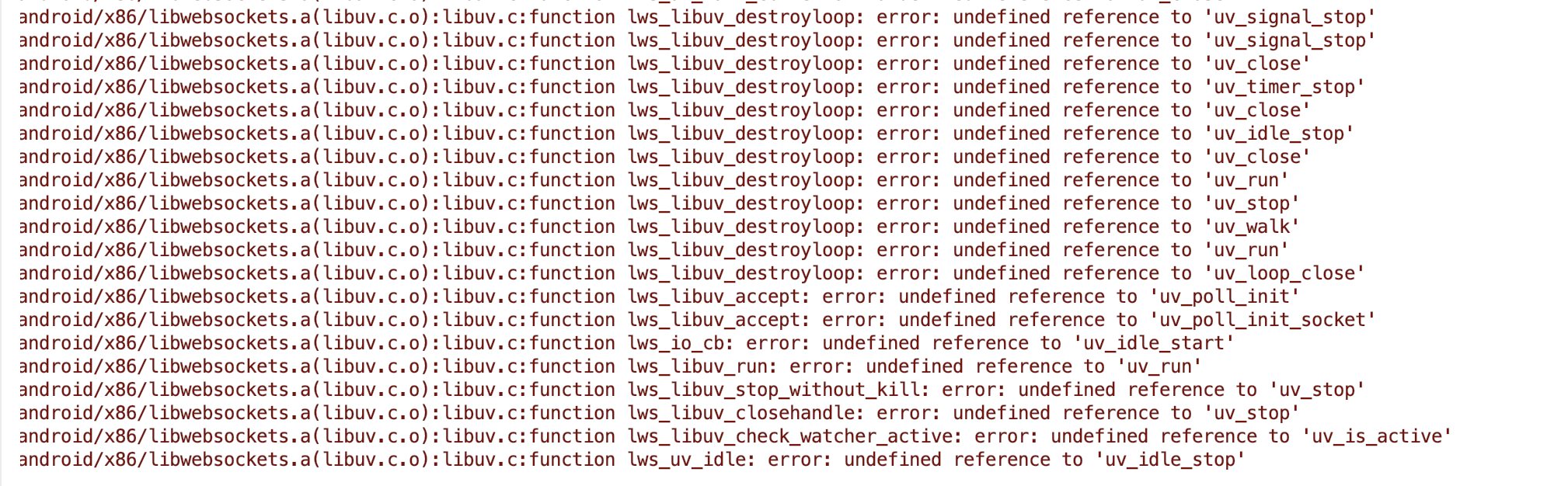 找一下 external 目录,看看 external/android/Android.mk 中是否包含 libuv 依赖,再看一下对应的构建平台(arm64-v8a, armeabi-v7a, x86)中是否包含 libuv.a