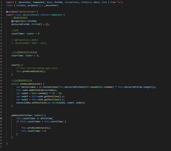 看上去是 this.obstacleNew 实例化失败了,cc.instantiate 是返回一个节点没错,但是从报错提示来看,this.obstacle 是 null,要查一下更早的报错,为什么 cc.instantiate 会失败
