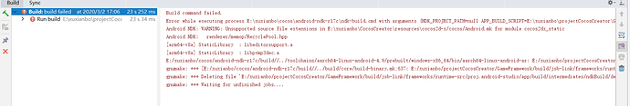 Error while executing process E:\xuxianbo\cocos\android-ndk-r17c\ndk-build.cmd with arguments {NDK_PROJECT_PATH=null APP_BUILD_SCRIPT=C:\GameFramework\build\jsb-link\frameworks\runtime-src\proj.android-studio\app\jni\Android.mk NDK_APPLICATION_MK=C:\GameFramework\build\jsb-link\frameworks\runtime-src\proj.android-studio\app\jni\Application.mk APP_ABI=x86 NDK_ALL_ABIS=x86 NDK_DEBUG=1 APP_PLATFORM=android-16 NDK_OUT=C:/GameFramework/build/jsb-link/frameworks/runtime-src/proj.android-studio/app/build/intermediates/ndkBuild/debug/obj NDK_LIBS_OUT=C:\GameFramework\build\jsb-link\frameworks\runtime-src\proj.android-studio\app\build\intermediates\ndkBuild\debug\lib NDK_TOOLCHAIN_VERSION=clang NDK_MODULE_PATH=E:\xuxianbo\CocosCreator\resources\cocos2d-x;E:\xuxianbo\CocosCreator\resources\cocos2d-x\cocos;E:\xuxianbo\CocosCreator\resources\cocos2d-x\external -j4 NDK_DEBUG=1 C:/GameFramework/build/jsb-link/frameworks/runtime-src/proj.android-studio/app/build/intermediates/ndkBuild/debug/obj/local/x86/libcocos2djs.so}