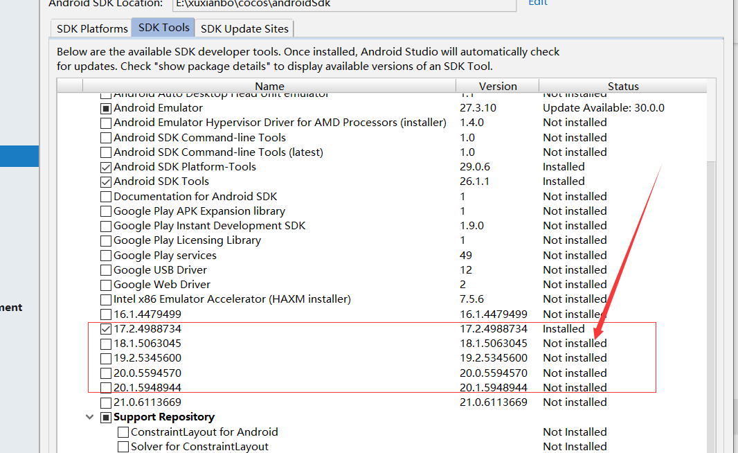 折磨人呀。用Cocos2d-x时 都是自己下载ndk来配置。 这边不知到为什么得直接用AndroidStudio得sdk里面推荐下载才不会出问题。
