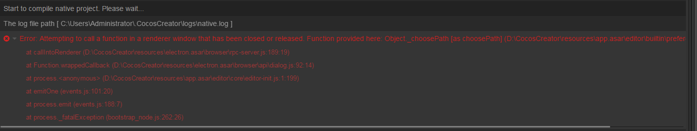 正在执行:'"D:\CocosCreator\resources\cocos2d-x\tools\cocos2d-console\bin\cocos" jscompile -s "D:\010\ddmj_20161230\client\build\jsb-default\frameworks\runtime-src\proj.android\assets" -d "D:\010\ddmj_20161230\client\build\jsb-default\frameworks\runtime-src\proj.android\assets" --env "COCOS_X_ROOT=D:\CocosCreator\resources\cocos2d-x;ANDROID_SDK_ROOT=C:\Users\Administrator\AppData\Local\Android\Sdk;COCOS_CONSOLE_ROOT=D:\CocosCreator\resources\cocos2d-x\tools\cocos2d-console\bin;NDK_ROOT=C:\Users\Administrator\AppData\Local\Android\Sdk\android-ndk-r13b;COCOS_FRAMEWORKS=D:\CocosCreator\resources\;ANT_ROOT=D:\apache-ant-1.10.7\bin"'