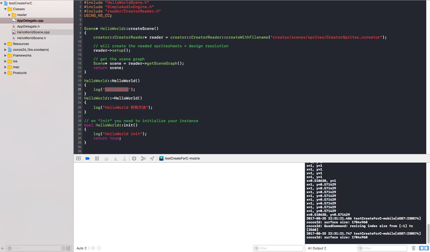 试了仓库里提供的sample, cocos2d-x-creator-cpp-support-test-v315.zip 用vs2013打开cpp-empty-test下的win32项目, 加入reader的内容,编译成功,顺利运行. 程序里的每个测试都是正常的,除了第一个"Animation". 有个小人飘了一会,程序报错.卡在: