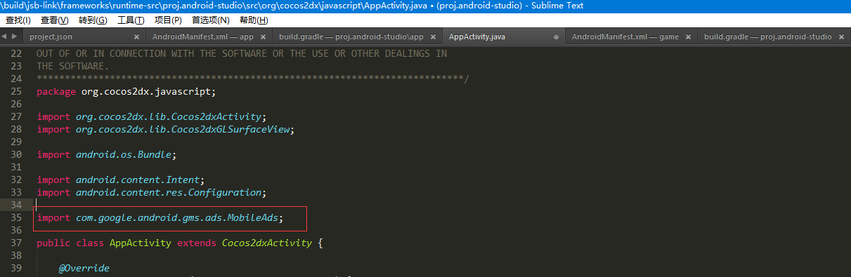 在AppActivity.java文件 加一句 import com.google.android.gms.ads.MobileAds; 就会编译出错,不加的话就能编译成功