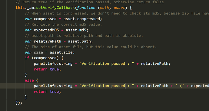 AssetsManager.setVerifyCallback用于设置文件校验回调,在Cocos官方Demo中,VerifyCallback回调函数强行返回了true,默认下载文件是没有问题的。但在真实项目中,如果在更新过程中遇到网络断线、在wifi和4G之间切换很容易造成下载的文件出错,如果是碰巧遇到更新的代码出错就惨了,因此还需要把真实的文件校验加上,看下面代码: