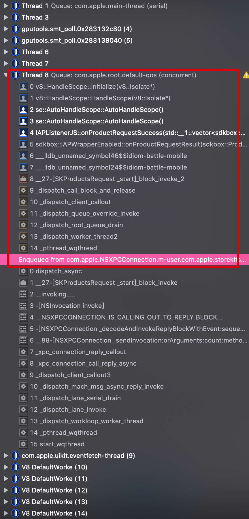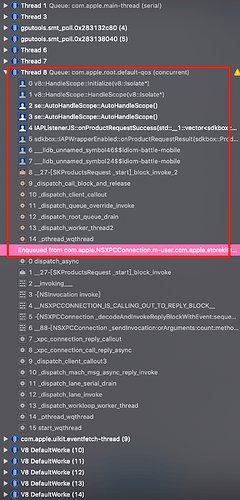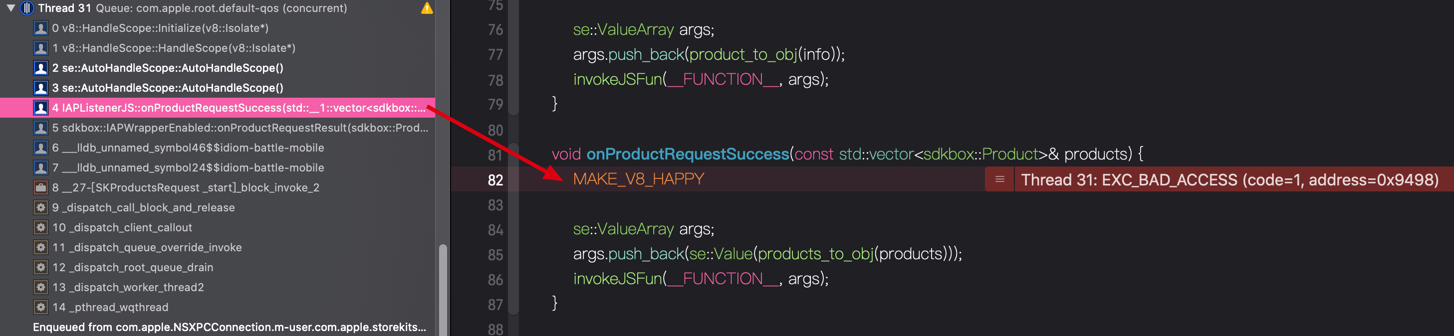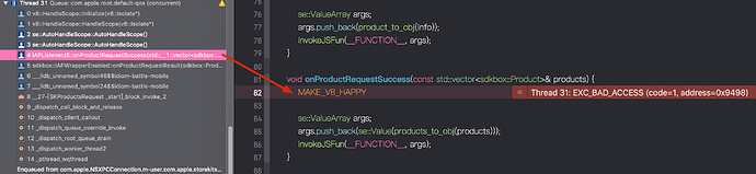然后在游戏的初始页面调用这里的IAPManager.init()。结果就遇到闪退的问题,在XCode中查看出错时的调用堆栈如下: