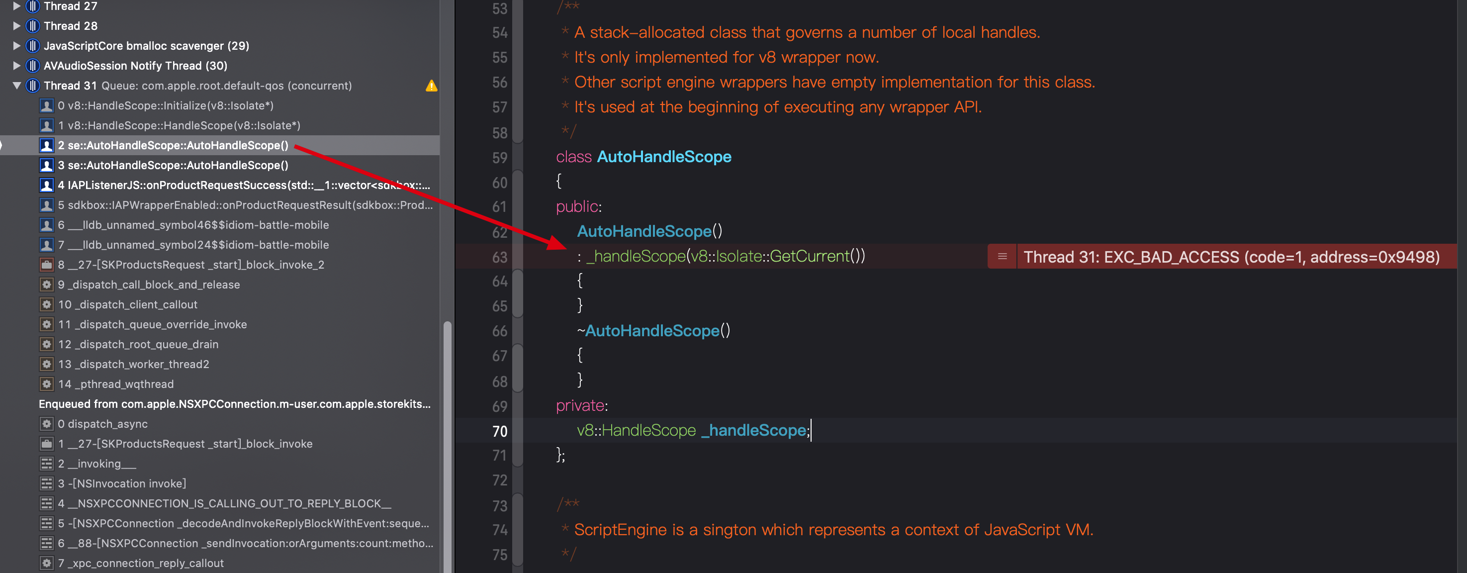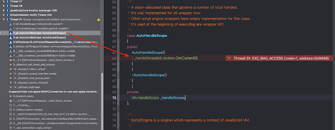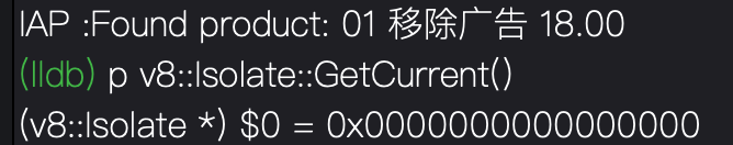 程序就是崩在这里。在这儿用XCode的调试工具打印v8::Isolate::GetCurrent(),结果为0: