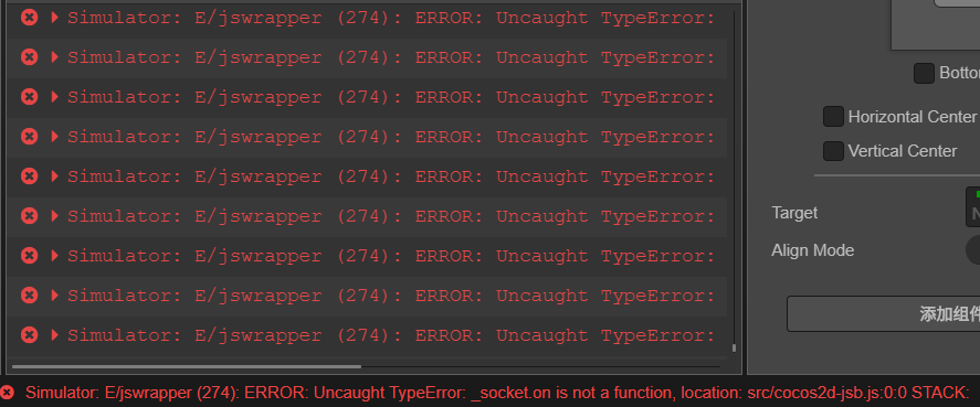 Simulator: E/jswrapper (274): ERROR: Uncaught TypeError: _socket.on is not a function, location: src/cocos2d-jsb.js:0:0