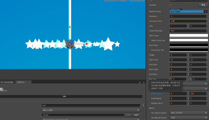 下面的Start Radius 值设置为任意值,粒子实际效果都只会从x轴生成出现,2.0.7是从四面八方任意角度出现的