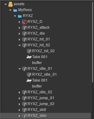 这边每一个fbx都是一个骨骼动画,那个RYXZ_skin是模型