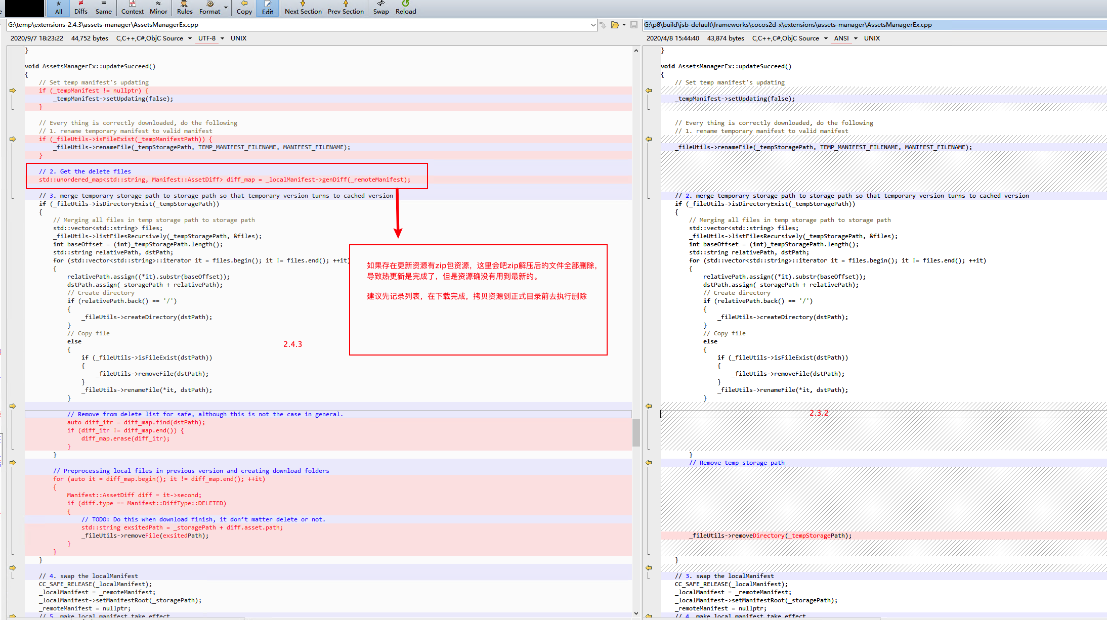 2.4.3 版本里面的热更新优化后,存在一个隐形的bug,如果热更新资源存在zip文件,并且zip里面的文件不在远程的project.manifest里面,解压后的zip文件会别当做不需要的资源删除掉。