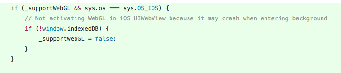 关于强制 Canvas 的问题也不用担心,微信在今年3月份左右应该就会顺利过渡到 WKWebView 版本,现在的判断代码也会自动让游戏切换到 WebGL 模式