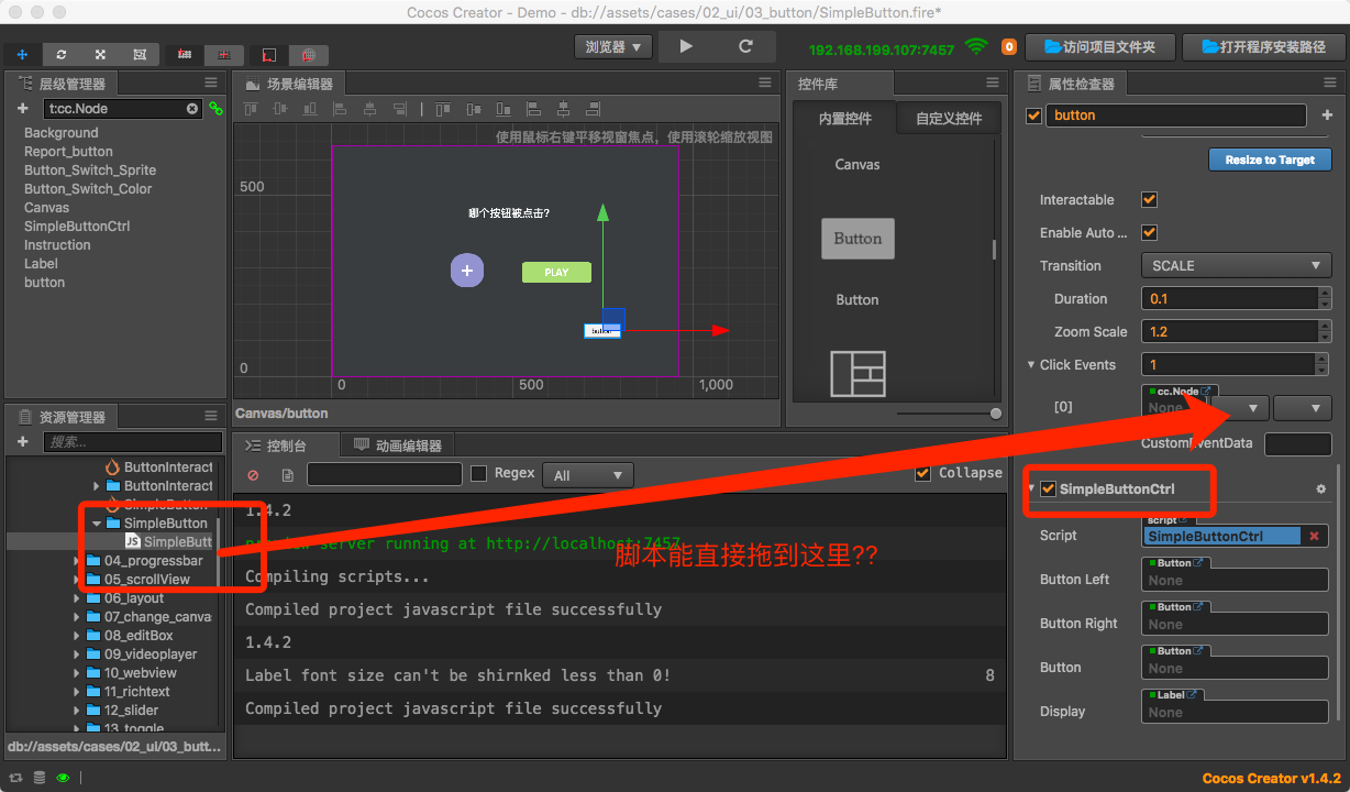 hello world 就是用cocos creator建的拖拽了几个ui,之后打算弄个按钮事件,看了一下button的文档
