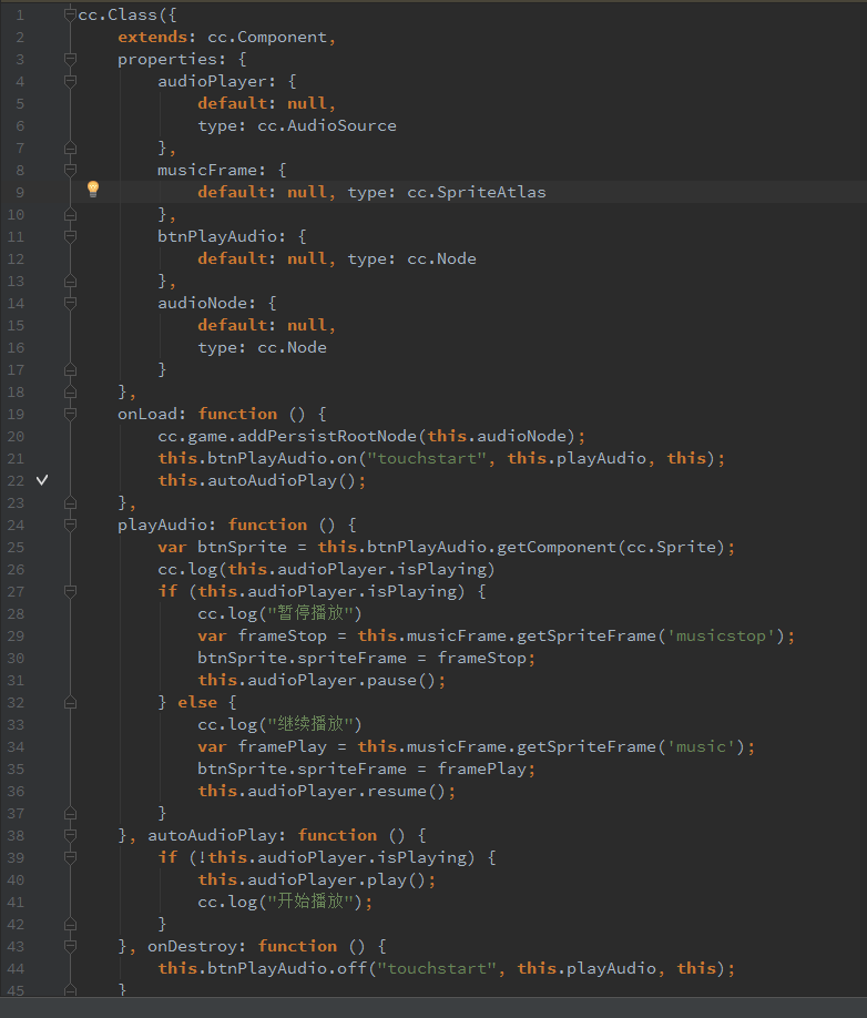 常驻节点要求AudioSource节点在根点上,我写的playAudio不能控制继续播放和暂停播放了,请帮忙看看!
