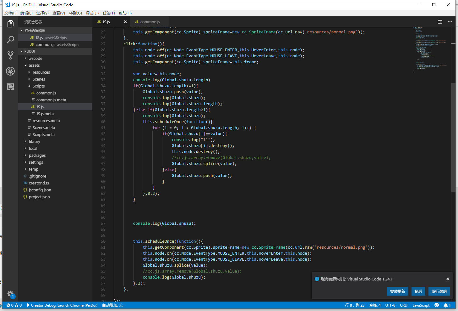 cocos creator里面怎么判断数组中是否包含特定值?还有怎么让特定值从数组中删除呢?为什么怎么写都不对,求大神帮忙!!!!我的需求是点击小球,两两配对,点到两个相同的就算是成功,我想到的是用数组 不知道有没有什么更好的办法 急急急 求各位大神帮忙!!!
