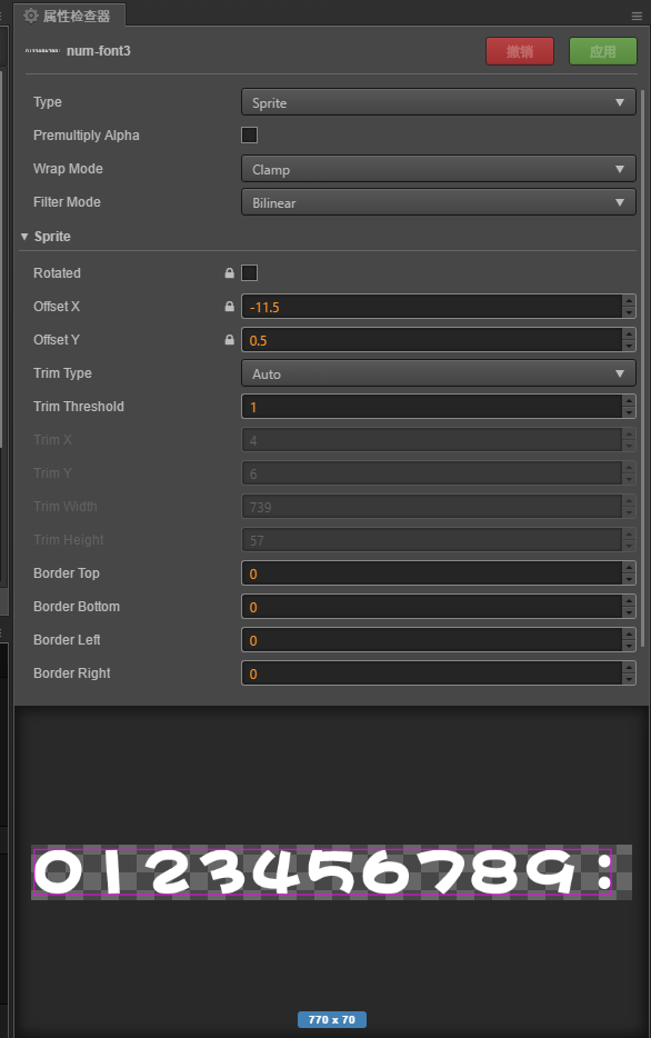 是你的图片被裁剪了,Trim Type改为Custom,Trim X和Trim Y 改为0,Trim Width 和 Trim Height 改为图片原始大小宽度一定要大于等于字符个数 * item width