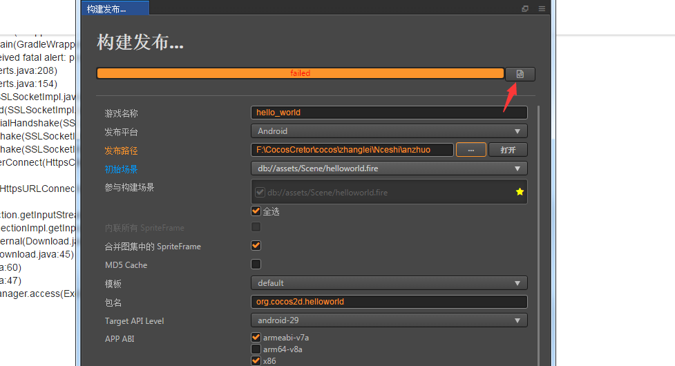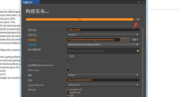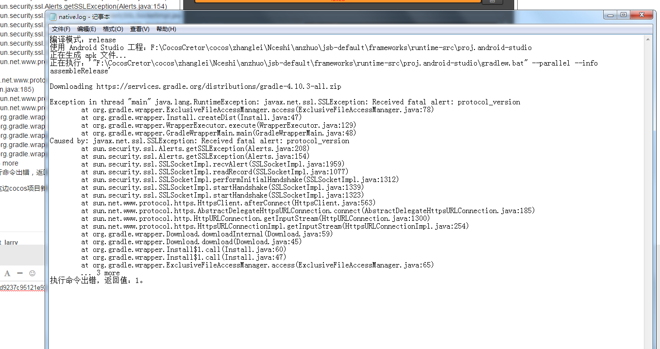 正在执行:’“F:\CocosCretor\cocos\zhanglei\Nceshi\build\jsb-link\frameworks\runtime-src\proj.android-studio\gradlew.bat” --parallel --info assembleRelease’