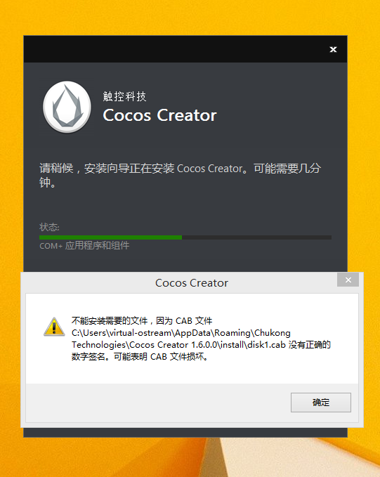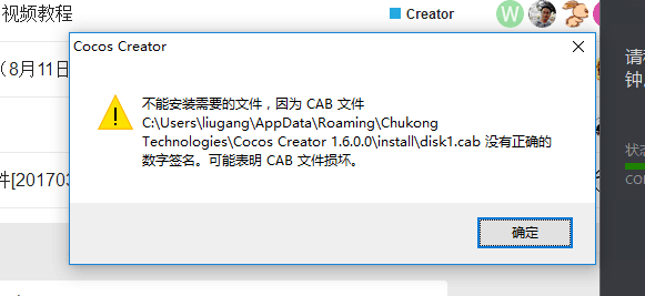 以前安装过cocos studio 卸载之后,现在安装cocos creator报CAB文件损坏,没办法安装,电脑是win10 64位,安装目录都试了,都不行。