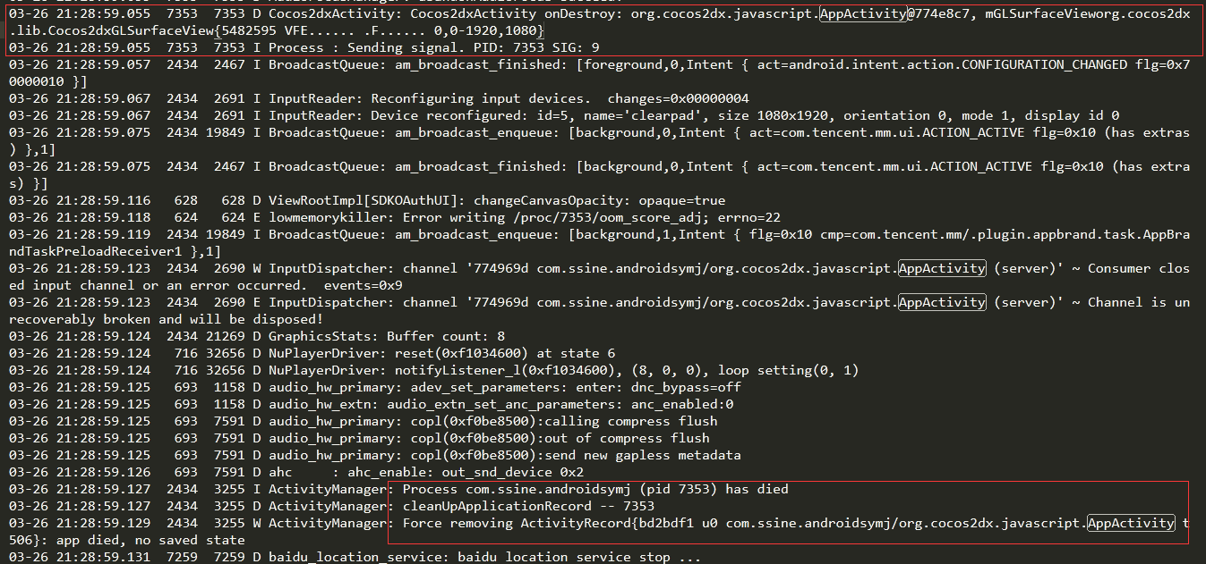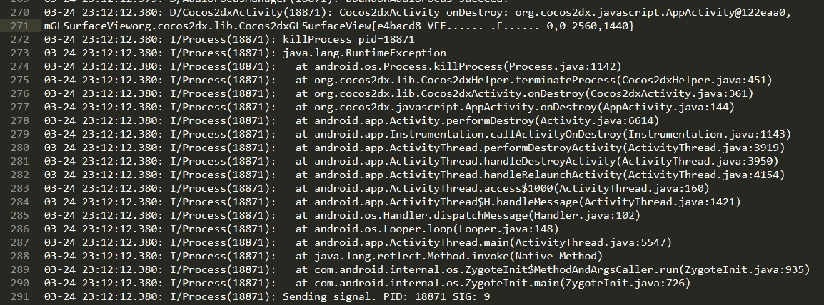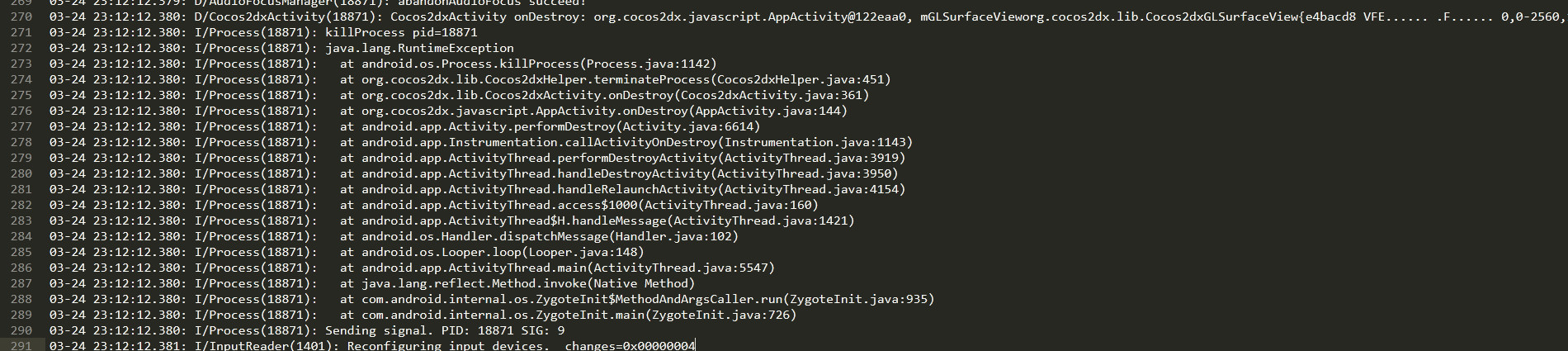 D/Cocos2dxActivity(18871): Cocos2dxActivity onDestroy: org.cocos2dx.javascript.AppActivity@122eaa0, mGLSurfaceVieworg.cocos2dx.lib.Cocos2dxGLSurfaceView{e4bacd8 VFE...... .F...... 0,0-2560,1440} killProcess pid=18871 java.lang.RuntimeException at android.os.Process.killProcess(Process.java:1142) at org.cocos2dx.lib.Cocos2dxHelper.terminateProcess(Cocos2dxHelper.java:451) at org.cocos2dx.lib.Cocos2dxActivity.onDestroy(Cocos2dxActivity.java:361) at org.cocos2dx.javascript.AppActivity.onDestroy(AppActivity.java:144) at android.app.Activity.performDestroy(Activity.java:6614) at android.app.Instrumentation.callActivityOnDestroy(Instrumentation.java:1143) at android.app.ActivityThread.performDestroyActivity(ActivityThread.java:3919) at android.app.ActivityThread.handleDestroyActivity(ActivityThread.java:3950) at android.app.ActivityThread.handleRelaunchActivity(ActivityThread.java:4154) at android.app.ActivityThread.access$1000(ActivityThread.java:160) at android.app.ActivityThread$H.handleMessage(ActivityThread.java:1421) at android.os.Handler.dispatchMessage(Handler.java:102) at android.os.Looper.loop(Looper.java:148) at android.app.ActivityThread.main(ActivityThread.java:5547) at java.lang.reflect.Method.invoke(Native Method) at com.android.internal.os.ZygoteInit$MethodAndArgsCaller.run(ZygoteInit.java:935) at com.android.internal.os.ZygoteInit.main(ZygoteInit.java:726) Sending signal. PID: 18871 SIG: 9