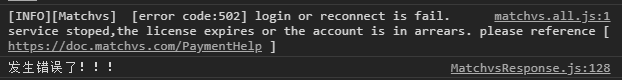 Matchvs给的错误码 https://doc.matchvs.com/APIDoc/erroCode 错误 502 服务停止,许可证失效 或者账号欠费