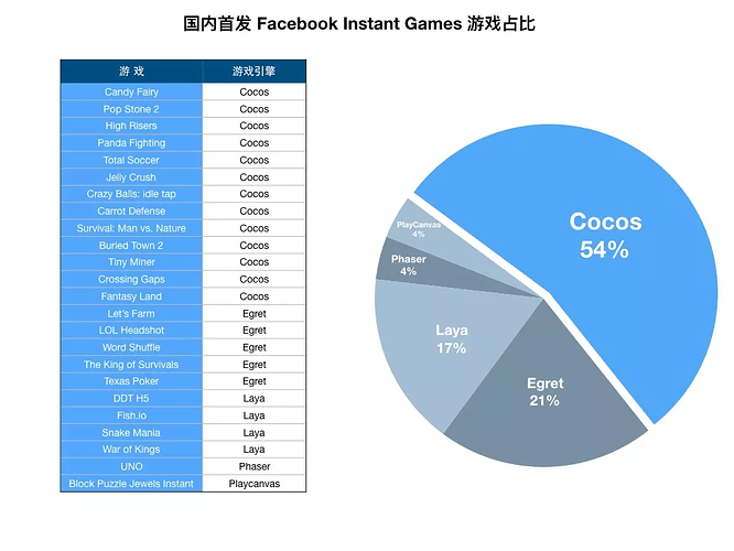 Cocos 引擎在 2016 年底就开始了和 Facebook 的合作,不仅在引擎技术层面早已完成支持适配,而且也代理发行了国内多款 H5 游戏上线,并产生了可观的广告收入。截止今天 Facebook Instant Games 正式发布的时间点,国内首批出海 Facebook Instant Games 平台的共有 24 款游戏,其中采用 Cocos 引擎的作品有 13 款,占比超过一半。非常荣幸,我们引擎的实力得到了游戏开发商和平台商的又一次认可。