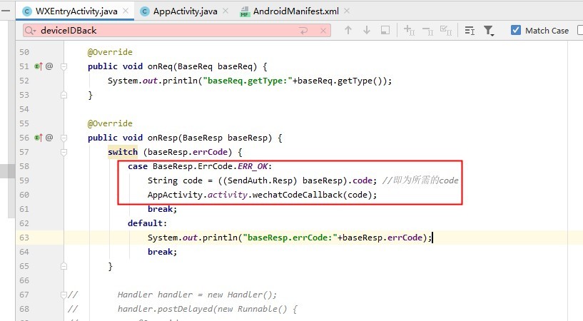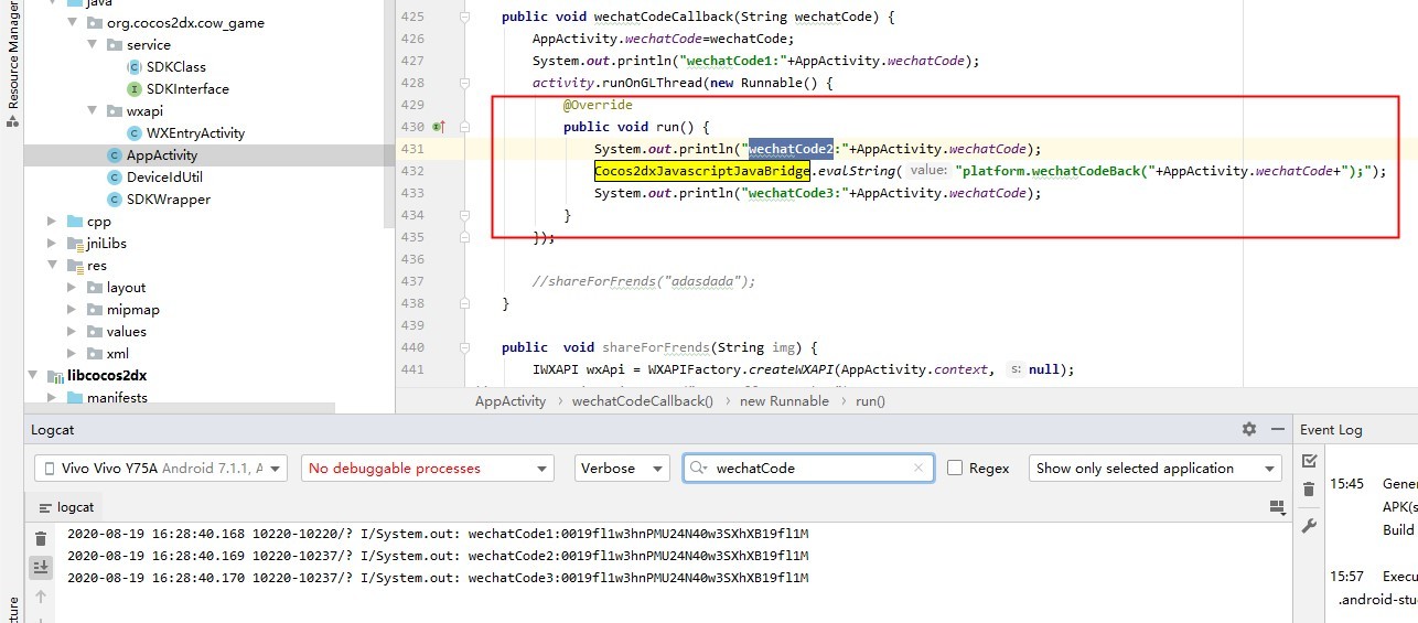 问题描述:在wxEntryActivity里获取微信授权后,调用AppActivity里面的方法wechatCodeCallback,然后使用Cocos2dxJavascriptJavaBridge将code传给js ,但是报错 js的打印没有显示。请大神或者官方给解决下 很急 谢谢