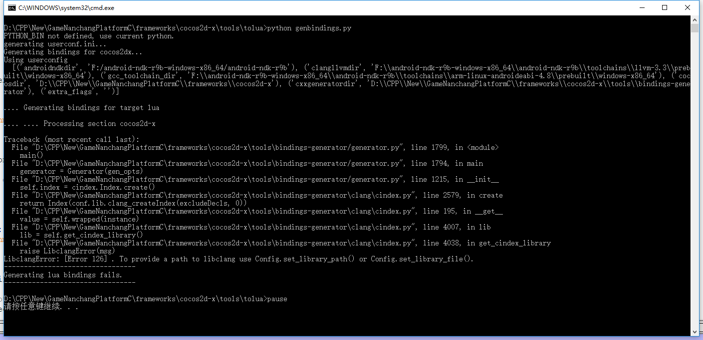 有没有大神指导Cocos Lua绑定C++运行脚本genbindings.py报错解决办法