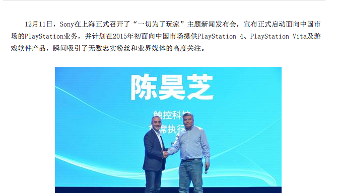2014年12月17日 - 作为移动开发世界的领军人物以及重要合作伙伴,触控科技CEO陈昊芝受邀出席,在演讲中首次公开了未来Cocos 2d-x引擎对PS4的全方位支持计划
