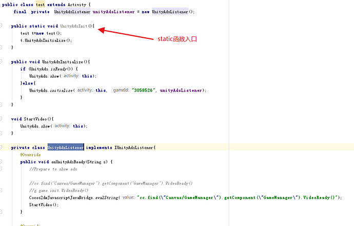 我按着Android的教程进行了对接,然后现在的情况是,cocos转Android使用了静态函数进行对接,但是在UnityAds里,初始化需要this,也就是无法在静态函数中直接执行。